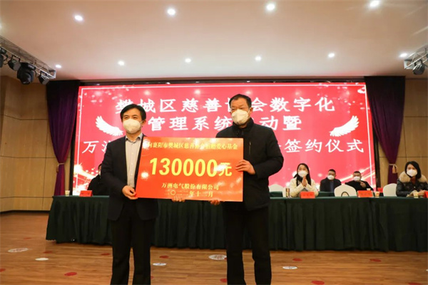 mksport体育电气为樊城区慈善协会捐款13万元成立“mksport体育电气公益基金”并获“慈善爱心单位”荣誉称号。mksport体育电气董事长、总经理赵世运参加签约仪式。