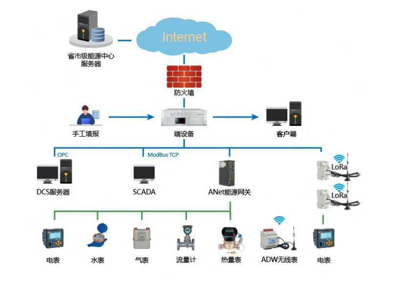 支持从现场的仪表通过Modbus(GB/T19582)、DL/T645、CJ/T188等协议采集需要的能耗实时数据,并进行汇总生成上报的能耗数据;
